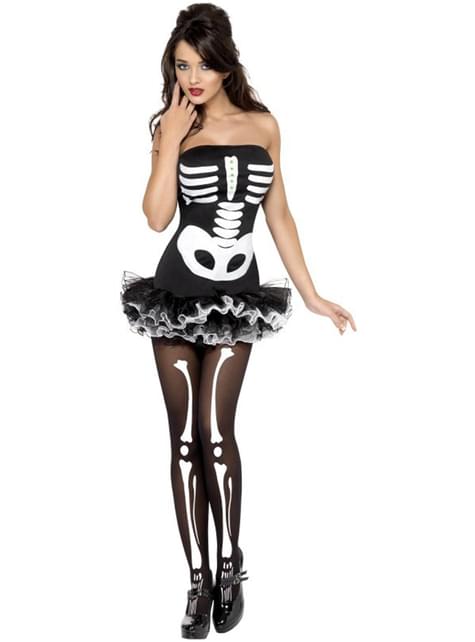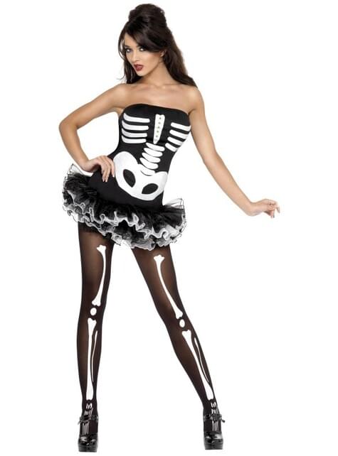Omvat een mini jurkje met tutu rokje en opdruk van een skelet.